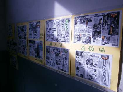 2年生は,12月15日(金)に,班ごとにコース計画を立てて大阪市内のいくつかのスポットを回り,そこに生活する人々や歴史・文化・産業などのかかわりを知るとともに,商業施設や平和学習施設の見学を行います。そして,修学旅行における班別研修の素地を作ることを目的にしています。階段の踊り場には,訪れる場所の写真と説明が掲示されています。階段を上り下りをする際に足を止めて,掲示物を見ている生徒たちがいます。