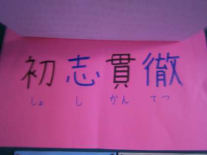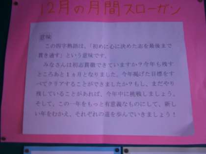 毎月,生徒会が考えてくれている「今月の言葉」を紹介します。各教室に貼ってある画用紙には,次のように書いてあります。「この四字熟語は,初めに心に決めた志を最後まで貫き通す」という意味です。皆さんは「初志貫徹」できていますか。今年も残すところあと1か月となりました。今年掲げた目標をすべてクリアすることができましたか。もし,まだやり残していることがあれば,今年中に挑戦しましょう。そして,この一年をもっと有意義なものにして,新しい年をむかえ,それぞれの道を歩んでいきましょう。」できることに取り組みましょう。