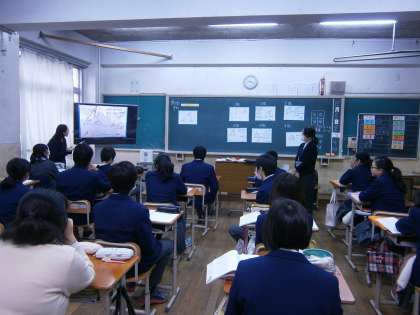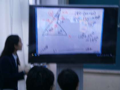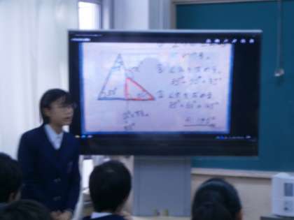 2年生の数学では,多角形の外角の和について学習しています。授業の前半,宿題の問題で出されていた問題について,その解き方を4人グループで伝え合いをし,指示された位置に座っている生徒が,角度の求め方についてモニターを使ってクラス全員に説明しました。同じ位置の角度を求めるのにも,3つの方法(解き方)があることが分かりました。生徒たちは,顔を上げ,テレビモニターを見ながら友達の説明を聞いていました。