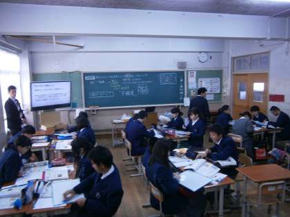 2年生の社会科の授業の様子です。この授業には,たくさんの他校の社会科の先生方の参観をしていただきました。授業では,豊臣秀吉が,なぜキリスト教保護の立場から禁止の立場に変わったのか。また,豊臣秀吉の海外政策について,キーワードとその理由を多角的,多面的に考えることができました。