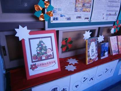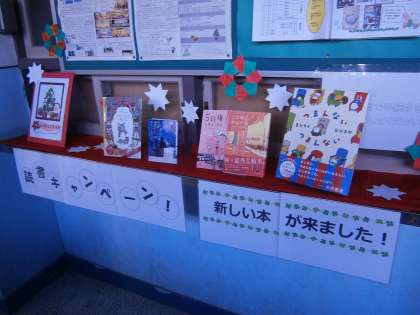 職員室前の書籍の紹介コーナーの模様替えが行われました。冬を強く意識したものに変わっています。書籍の貸し出し数は,現在1500冊を突破しています。昨年度は,年度末に1500冊,一昨年度は,1000冊でしたので,1500と言う数字は,今年の生徒たちが,いかによく本に親しんでくれいているのかを示していると言えます。また,先月開催された学校運営協議会では,書籍の内容はもちろん,その本の情報を伝えようとするパッケージ(デザイン)にも注目し,本全体を楽しんでほしいというアドバイスをいただいています。