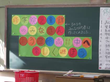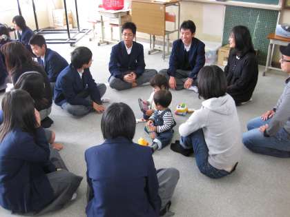 修学院児童館のみなさんとのふれあいを目的に、0歳から1歳までの赤ちゃん8人がやってきて中学生と交流を行いました。それぞれの紹介の後、グループになって楽器をつくり、その手作り楽器を使っての演奏会を行いました。また、紙芝居を中学生が赤ちゃんに読み聞かせるなど、平素の授業ではできないことを体験しました。