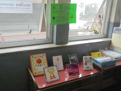 今学期から始まる「出張図書館」の取り組みを紹介します。図書委員会では,図書委員のおすすめの本を,各校舎の階段踊り場に並べています。その中から自分が読みたいと思った本を,図書室に持ってきてバーコードを読み取ったら,「貸出完了!」となります。委員たちも張り切って準備をしましてくれました。ぜひ、出張図書館に本を借りにきてください。