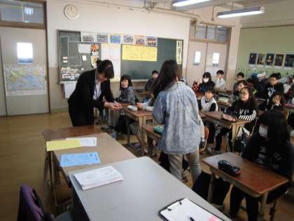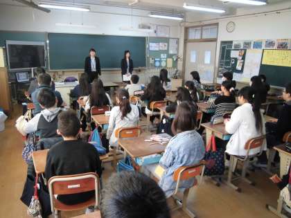 本校の英語科の教員2名が,校区の小学校は出かけ,6年生に授業を行いました。小学校での外国語活動のおかげで,How many people? と尋ねられた際に,英語で「数」を答えることができることや,知っている英単語数が多いことなど,「英語に親しみをもっている」「英語を話すことへの抵抗感がない」児童が増えていることがよく分かります。今回も,「もっと話せるようになりたい」という子どもたちの気持ちを汲み取り,積極的に英語を話そうとする姿勢を大切にした授業を行いました。写真は,教員と児童,また,児童同士が自己紹介をし合う様子です。