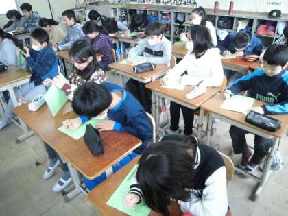 今日は,2名の英語科教員が,校区のもう一つの小学校6年生児童に英語の出前授業を行いました。子どもたちが,場面に応じていろいろなフレーズを知っていることや,英単語や英文を聞き取ることができるなど「外国語への慣れ親しみ」,「コミュニケーションへの積極性」を感じました。