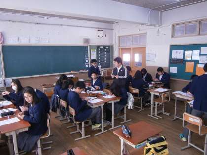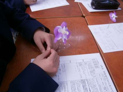 6時間目の学活の時間,2年生では,卒業式に3年生の制服の胸に着けてもらうためのコサージュづくりをしました。作り方のプリントとモニターに映る完成品を見ながら作りました。誰かが「リボンのつけ方が分からない」と声が上がると,誰ともなく助けてくれていました。完成間近となってきました。学級の様子や素晴らしい出来栄えの完成品をご覧ください。