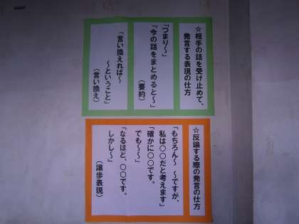 2年生の廊下には,写真にあるような話し方のお手本が貼られています。先月,国語の授業で,パネルディスカッションについて学習しました。この学習を通して,自分の主張を感情的にではなく,論理的に展開することを習得できるように,また,相手の考えをきちんと受け止め理解できるようにすることで,物事を多面的に見ることができるようになってほしいと思います。