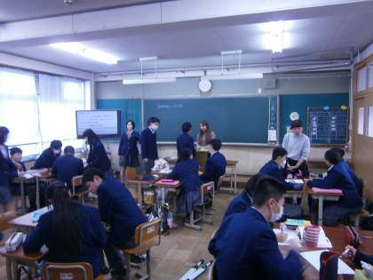 4組では,英語の授業が行われています。生徒たちは,ALTの先生から「生きた英語」を学んでいます。相手を意識して英語を話すことで,使用場面と英語をセットで覚えることができるのです。どの生徒も英語を話すときは,素敵な笑顔になっています。