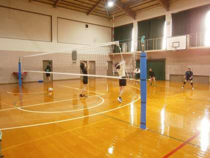 体育館の部活動の様子の続きです。昨年度は,普段の練習や試合に出るために合同チームを組んでいた女子バレーボール部は,新入部員2名を加え6名が練習に取り組んでいました。卓球部の1年生は,先輩のノックを受けていました。