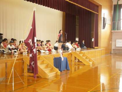 今回は,各部の3年生がステージに上がり,試合に臨む決意を全校生徒に伝え,1,2年生は,それに拍手でこたえてくれました。写真は,左から,最初に発表してくれた卓球部,真ん中はサッカー部,最後を締めくくってくれた野球部です。