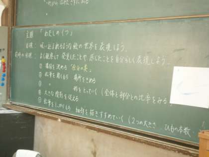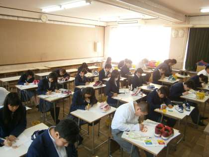 1年生の美術の授業では,「吸い込まれるような絵の世界を表現すること」を目標に,自分の靴を描いています。黒板には,前回の目標(できるようになっていること)や今日の目標を達成するための手順が示されています。生徒たちは,黒板に書いてある手順を確認し,教員の表現技法についてのアドバイスを受け,自分のペースで絵を描くことで,目標の達成を目指していました。