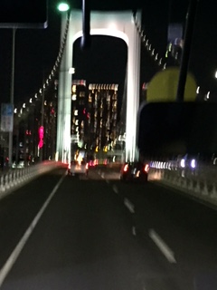 今日の行程もいよいよ終わりに近づいています。ホテルまであと少しのところまで来ています。車窓から,レインボーブリッジと東京タワーが見えます。京都も素晴らしいけれど,東京には違った素晴らしさがあります。