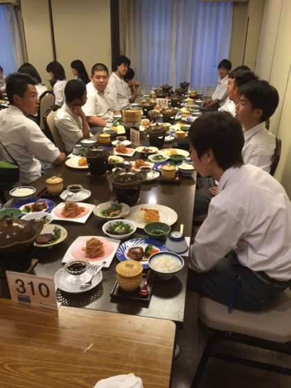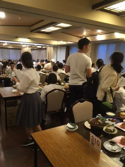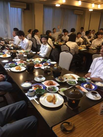 夕食が始まっています。午後からの活動で,お腹がぺこぺこという生徒も多かったことと思います。さて,食事会場は,「和」の落ち着いた雰囲気のあるお部屋です。ステーキ,コロッケ,エビフライが見えます。