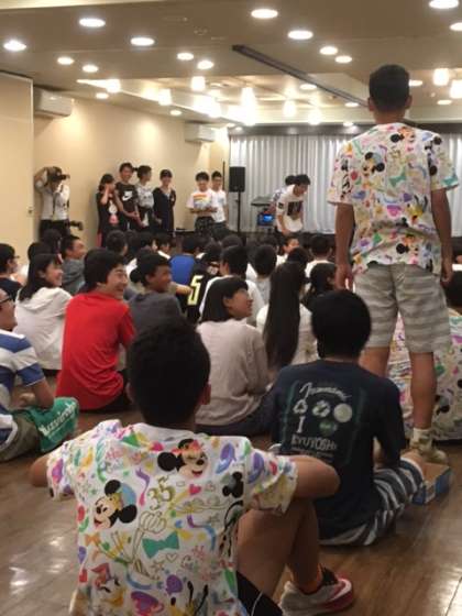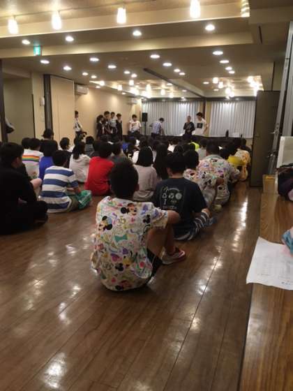 レクの会場に移動し,お楽しみの時間が始まりました。レク係が準備してくれたとっておきのゲームやクイズが始まりました。今日の東京都内の班別研修でクタクタになった心と体をほぐしましょう。