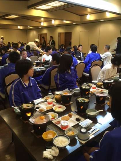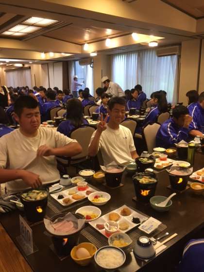 朝ごはんです。種類も多く,朝からこんなに食べられるかなあといいながらも,にぎやかに食事がはじまりました。現在は,朝食も終わり,部屋の片づけと今日の午前の活動の準備をしています。