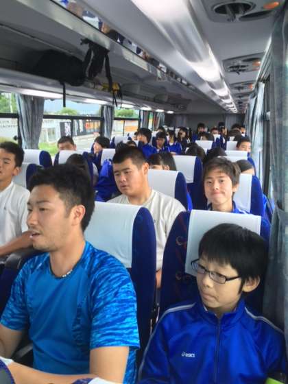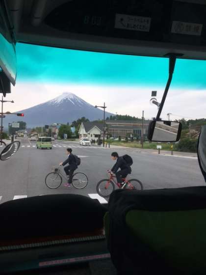 カーリング体験生徒たちのバスが予定していた時刻に出発しています。バスの車中からも富士山がきれいに見えます。