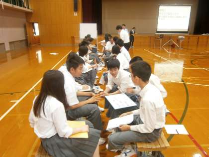 3年生では,学年道徳が行われました。全員が体育館に集合し,脳死臓器移植についての六人の意見が紹介されている資料をもとに,脳死臓器移植の是非を問うだけでなく,生命がかけがえのないものであるということやその尊さに気づき考えを深めました。写真は,グループごとに意見交流をしている様子です。