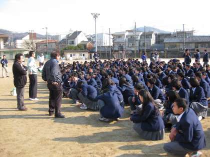 5分以内に全員が避難することを目標としましたが、整列にまでかかった時間は4分30秒。人員の確認に若干時間はかかりましたが、概ね迅速な行動がとれました。17年前の「阪神淡路大震災」を例に、被害を最小限に食い止めるための知識と行動について、考えることができました。