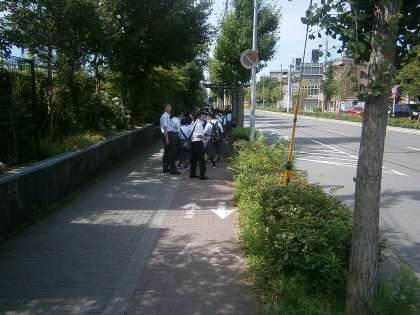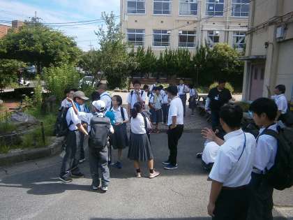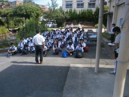 1年生は,校外学習(京都人権新発見)に出かけました。今日のために班で,京都市内の人権にかかわる12の場所から2〜3カ所を選び,行程表を作成させました。今日,発見したことをレポートにまとめ,秋の文化祭で発表します。写真は,学校を出かけるときの様子です。