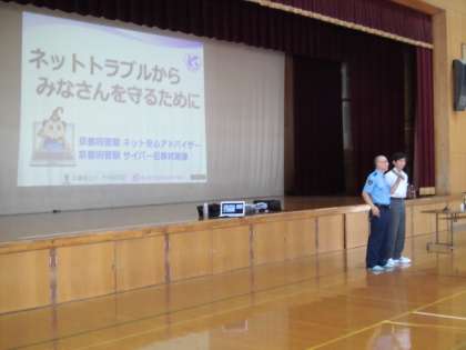 2時間目には,全校生徒が体育館で,「ネットトラブルからみなさんを守るために」というお話を聞きました。講師として,京都府警察ネットアドバイザーの方と下鴨警察署生活安全課少年係の方に来ていただきました。いくつかの具体例をもとに,インターネットと上手につきあう方法についてのお話をしていただきました。暑い中をお越しいただきありがとうございました。