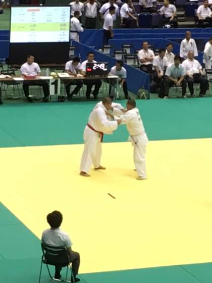 90kg超級に出場している選手は,1回戦ということもあり,少し緊張していたようにも見えましたが,終盤に払腰で技有をとり勝ちました。秋田の選手と対戦をしました。堂々とした姿でした。