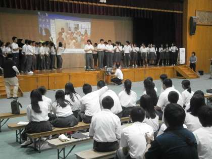 今日は,ステージ発表がありました。学年,学級,教科,生徒会,部活動からの発表がありました。ビブリオバトルは3年目となり,発表する側,聞く側ともに成長が感じられました。写真は,1組発表の様子です。1〜3年のたくさんの生徒がステージに上がり,一緒に手話で歌を披露してくれました。