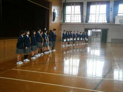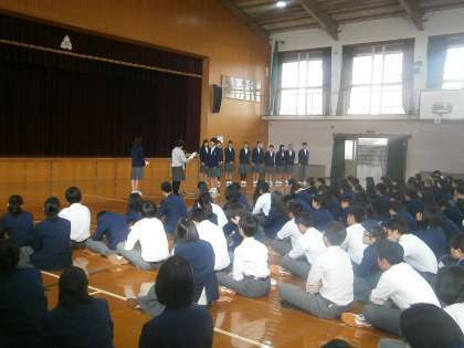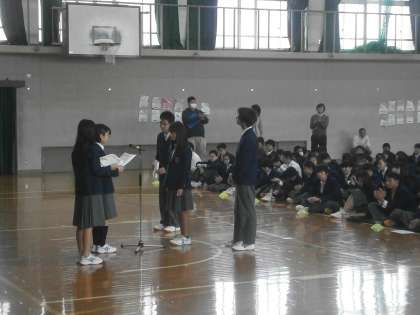 6時間目に体育館で認証式が行われました。高野中の生徒会は,生徒225人という大きな組織の生徒会です。新本部役員・委員長は,ちょっぴり不安を感じながら,今日の6時間目の認証式をむかえたことと思います。前生徒会長からのお礼のあいさつのあと,新生徒会長からは,前の本部役員からよいところを引き継ぎ,さらなる高みを目指すという決意表明があり,大変頼もしく思いました。また,新本部役員・委員長のあいさつからは,高野中のみんなのために頑張るとの秘めた思い,皆と一緒にこれからの高野中をつくって行くのだという前向きな気持ちを強く感じました。本部役員・委員長の認証に続き,各クラスの委員の認証式がありました。みなさんの今後の活躍に大いに期待したいと思います。これから1年間、どうぞよろしくお願いします。写真は,図書委員会の「図書室へ行こうキャンペーン」の表彰の様子,校長先生から認証書を受け取る新本部役員の様子,新旧本部役員の様子です。