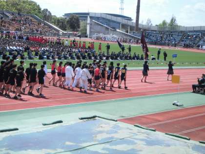 第61回春季総合体育大会 開会式が西京極陸上競技場で行われました。吹く風が冷たく,天候も心配されましたが,高野中学校の行進時には,晴れ間ものぞき,その中を堂々と行進することができました。また,全体の行進の先頭を本校の先生が務められました。