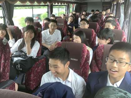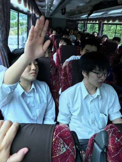 早速、バスレクが始まりました。まずは、イントロクイズ。結構な盛り上がりです。このまま昼食場所の金立S Aに着きそうです。