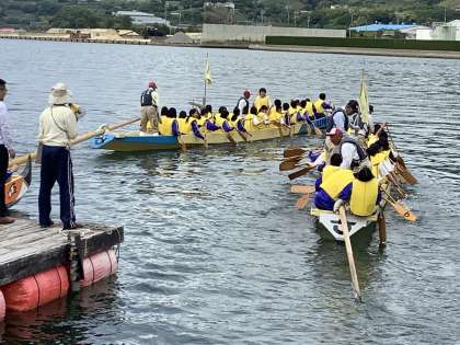それぞれのクラスのペーロン船が太鼓の音に合わせて漕ぎだしました。各クラス威勢のよい,声で元気よく取り組んでいます。