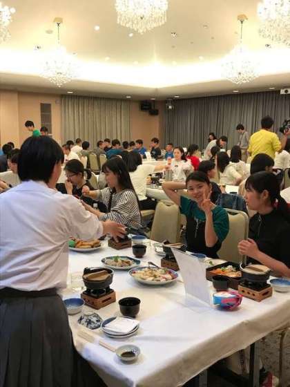 修学旅行委員の号令に合わせて全員で「いただきまーす」楽しい夕食が始まりました。