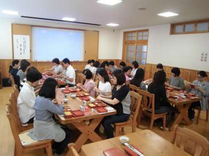 本日,PTA保健委員会主催の給食試食会を行いました。中学生の保護者だけでなく,小学6年生の保護者にも参加していただき,合計25名で行いました。前半は,京都市教育委員会 体育健康教育室から2名の方に来ていただき,中学校給食についての説明をしていただきました。中学校給食が中学生にとって必要なカロリーや栄養のバランスをとても考慮して作られていること,食材や製造過程も安心できることがよくわかりました。特に本日の献立は野菜の量が多く,ごはんもカレーピラフ,ヨーグルトもついていて,みなさんでおいしくいただきました。講演でお世話になった体育健康教育室の2名の方,ありがとうございました。