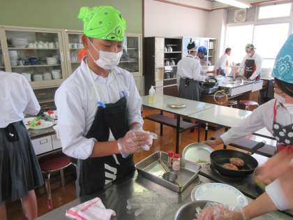 2年生は,家庭科の時間に調理実習を行いました。「ハンバーグ」を作りました。みじん切りにした玉ねぎとミンチをこねる作業や,フライパンで焼く作業を初めてやった生徒もいました。普段,家では何も料理をしない,したこともない生徒が多いみたいです。調理実習をした感想を何人かに聞くと,「楽しく料理できました」「家でも玉ねぎのみじん切りをやってみようと思います」「料理を手伝いたくなりました」など,男女問わず,今回の学習を家でも実践しようと思っている生徒がたくさんいました。乞うご期待です。