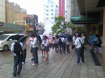 午前中の長崎市内班別研修。天気予報通り雨が降ってきました。「長崎は今日も雨だった!」班別にホテルを出発します。12時に昼食場所のオランダ物産館に集合です。