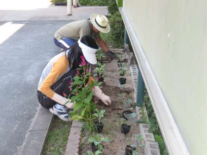 「葉ボタン」を植えました。耐震工事の関係で高中自慢の「花時計」は現在閉鎖中。生徒達は工事関係の機材や、フェンスに囲まれていましたが、、若干殺風景な校内に新たな装いが生まれました。