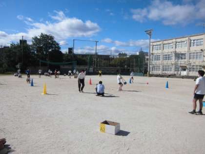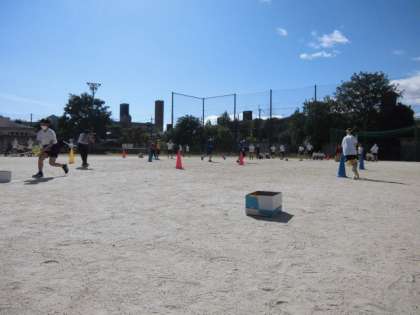 次の種目は,竹の棒を2本持ってスタートし,途中からボールを1球挟みながら進みます。上手に竹でボールを挟んでゴールを目指しました。