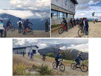 午後の白馬選択体験,「マウンテンバイク」の様子です。マウンテンバイクはゴンドラに乗って上まで移動し,約4キロの道を走行します。白馬の大自然を風で感じていることでしょう。