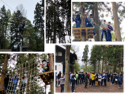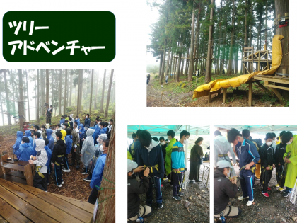 選択体験「ツリーアドベンチャー」の様子です。到着時,濃霧でしばらく待機がありましたが,無事体験することができました。最初にハーネスをつけ,安全面の確認をしました。グリーンコース、イエローコース、レッドコースの3コースがあるそうです。とても身軽にコースを進んでいます!