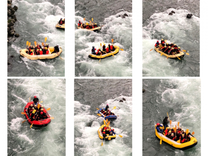 全長12kmの犀川ラフティング。橋の上からの撮影でしたが,とても迫力がありました。途中,少し慣れてパドルで先生に合図を送ってくれました。アルプスの大自然の中,景色も楽しみ,日常ではできない貴重な体験ができました。