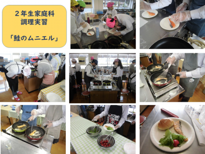 本日,2年生家庭科で調理実習を行い,「鮭のムニエル」に挑戦しました。手順をしっかり確認し,もくもくと調理を進めました。とても美味しそうな鮭のムニエルに仕上がりました!