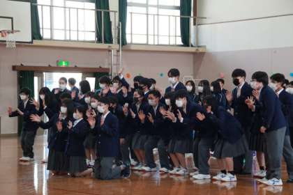 1年生は体育館,2・3年生はリモートで教室での参加です。
