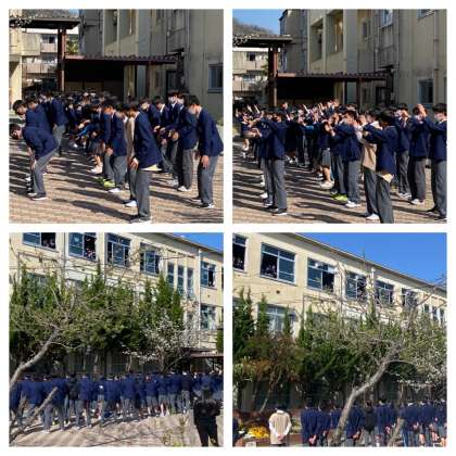 1年生が教室の窓から,校舎の下を見ると,3年生が整列をし,