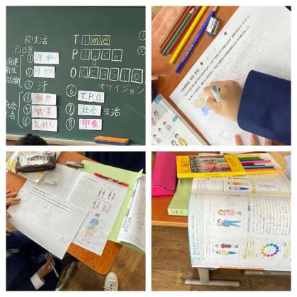 1年3組の家庭の授業では,【私らしさとT・P・O】というテーマで,服装について目的に応じた着方を踏まえ,自分らしい着方について考えました。どんなときにどんな服装にしたらよいのか,色も使いながらプリントにさまざまな服装を描きました。