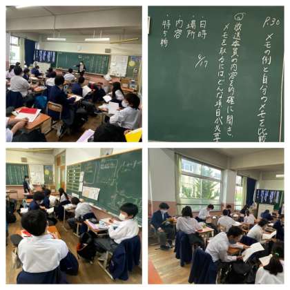 1年4組の国語の授業では,【必要な情報を的確に聞き取る】について学習しました。話の中で要点をおさえて聞き,その要点をメモするにはどうしたらよいか,ペアで実演しながら取り組みました。