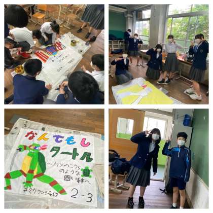 放課後取り組んでいる2年生の学級旗が完成間近です。どのクラスもクラスの個性を生かした素敵な学級旗ができてきています。