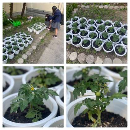 2年生はどのクラスも本日の技術の時間に,自分の名前を記した鉢にミニトマトの苗を植えました。