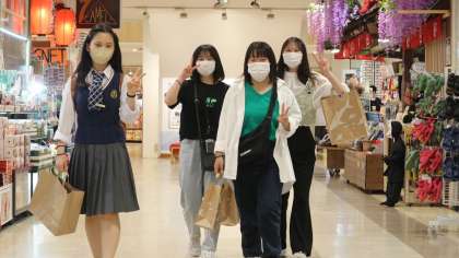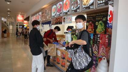 4組が天保山マーケットプレースでご飯を食べて遊んでいます。