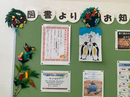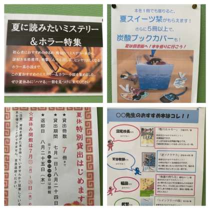 図書館に向かう階段の踊り場の掲示板には「夏に読みたいホラー特集」、「夏スイーツ栞と炭酸ブックカバー」、「夏休み特別貸し出し」、「〇〇先生のおすすめ本はコレ!」についてと盛り沢山の掲示がされています!
