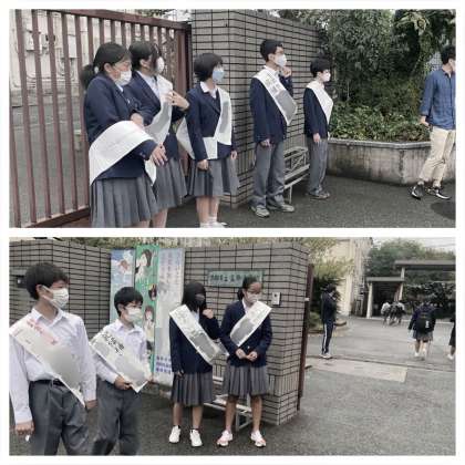 今週金曜日に行われる、生徒会本部役員選挙に向けて、それぞれの候補者が、朝校門前に立ち、全校生徒に声をかけています。