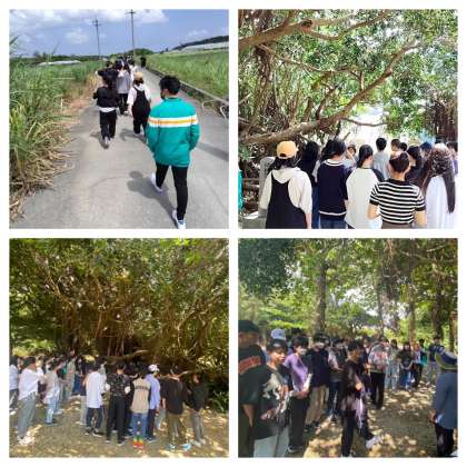 ガジュマルの大木の前でガイドさんの話を聞いています。